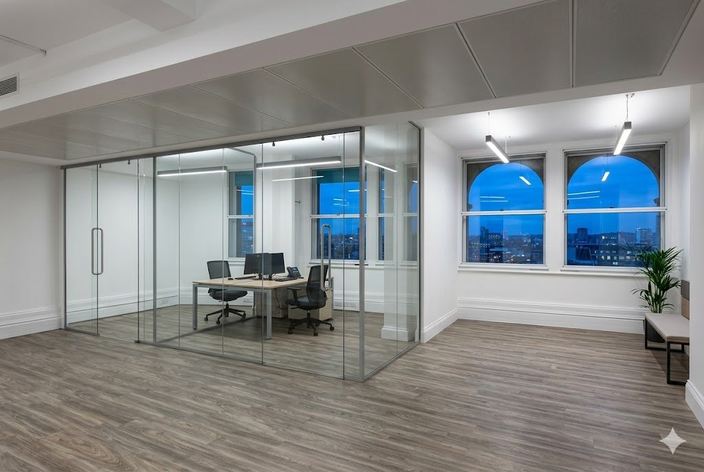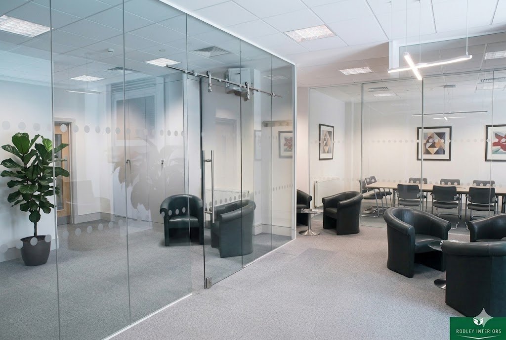 Modern glass office partitions create bright, professional spaces while maintaining privacy and openness